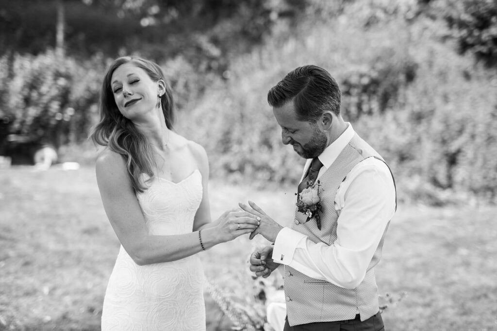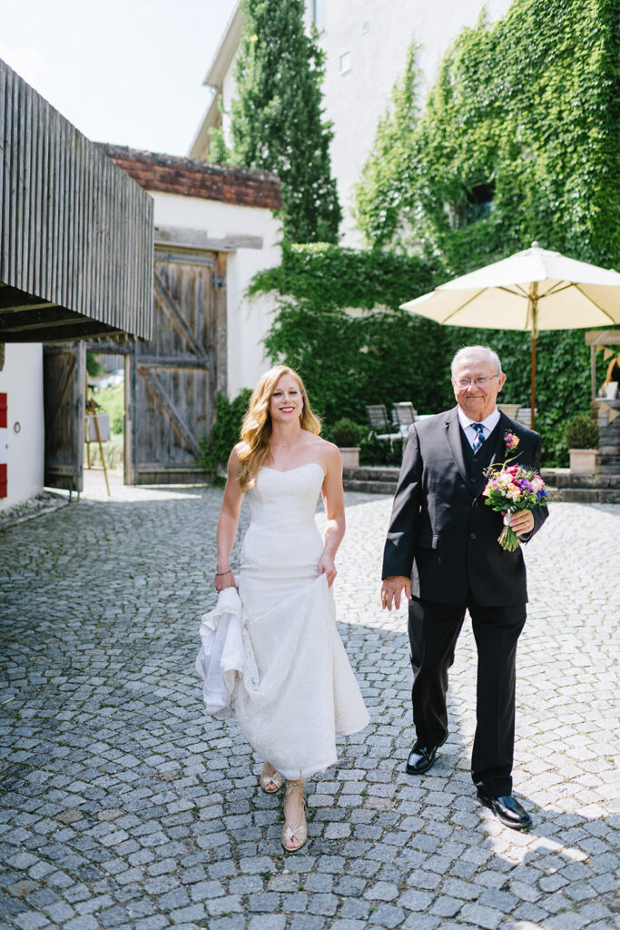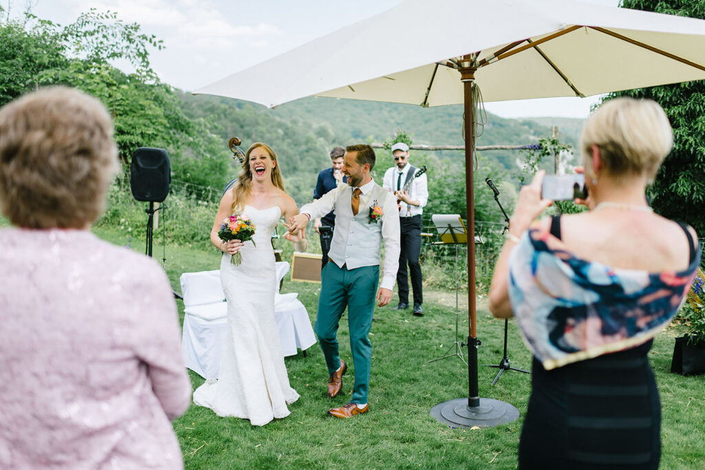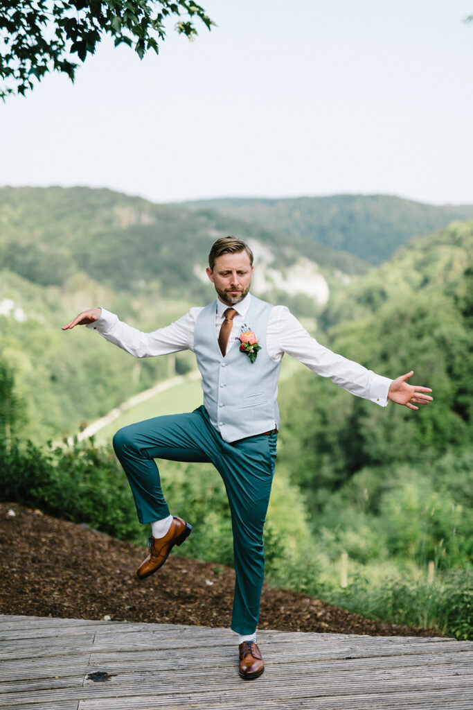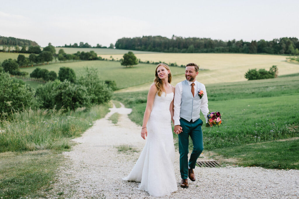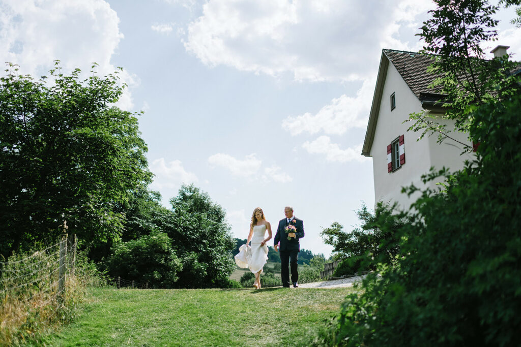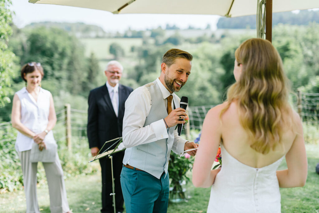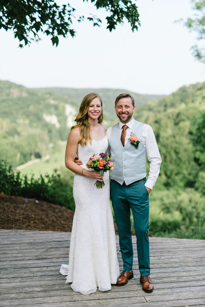 An American bride and her German groom celebrated their wedding at the picturesque Hofgut Maisenburg, a day filled with joy and international flair. The ceremony took place outdoors, surrounded by the idyllic landscape of the Swabian Alb. The natural setting of the estate provided a relaxed yet striking backdrop for this special occasion.