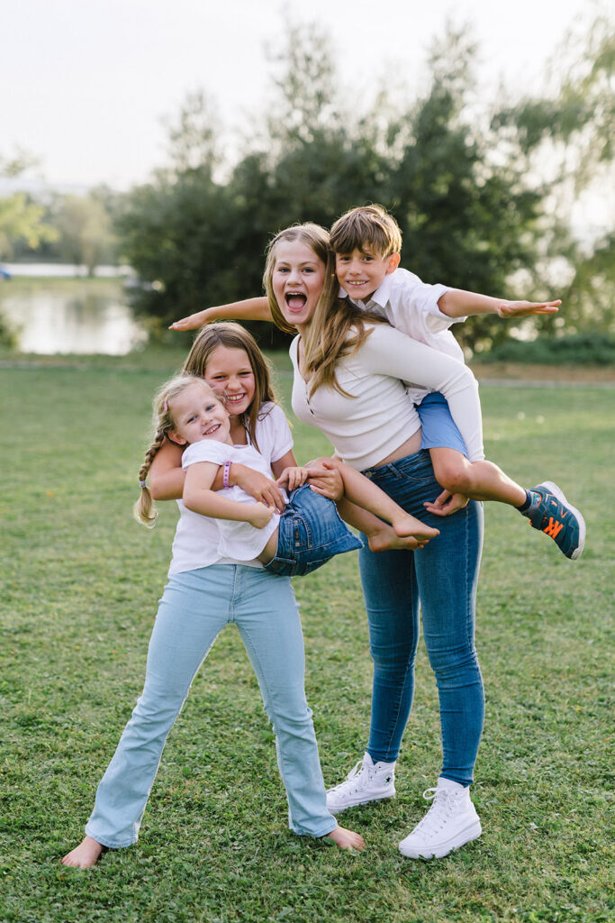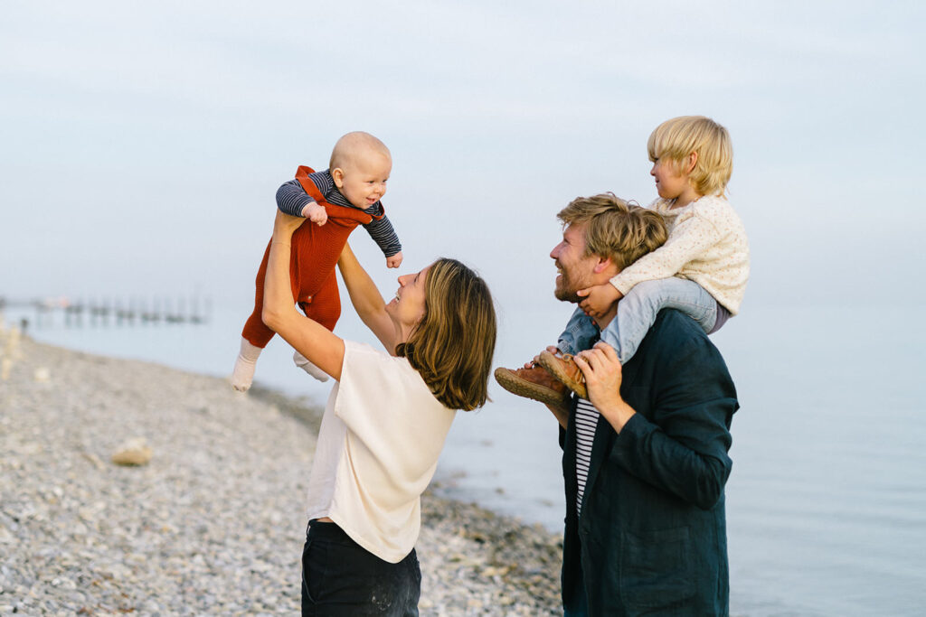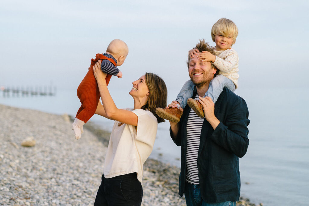 Beim Familienshooting gilt es, die Balance zwischen Sicherheit und Freiheit in der Situation auszuloten. Das heißt: Ich gebe euch gelegentlich sanfte Impulse und Ideen, stelle euch ins beste Licht, achte auf den Hintergrund – und führe gleichzeitig den psychodynamischen Spannungsbogen (was meist die größte Herausforderung beim Familienshooting mit kleinen Kindern ist). Ich spüre, was die Kinder (und damit verbunden oft auch die Eltern) gerade brauchen, damit sie sich entspannen können. Ich erkenne den Moment, in dem sich das Potenzial für echte, lebendige Familienbilder im Shooting entfaltet – und gehe mit, wenn die Energie langsam nachlässt, die Luft raus ist, ohne etwas zu erzwingen.