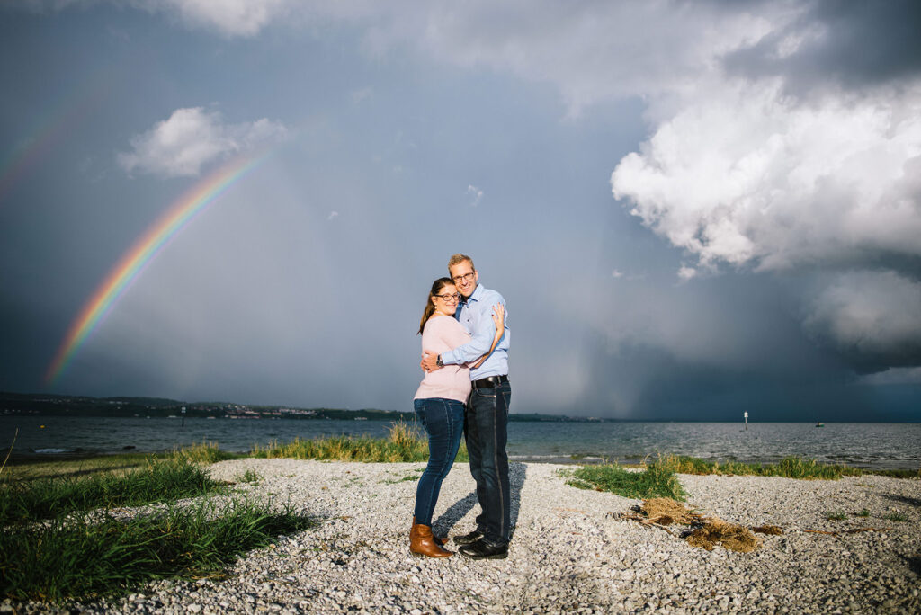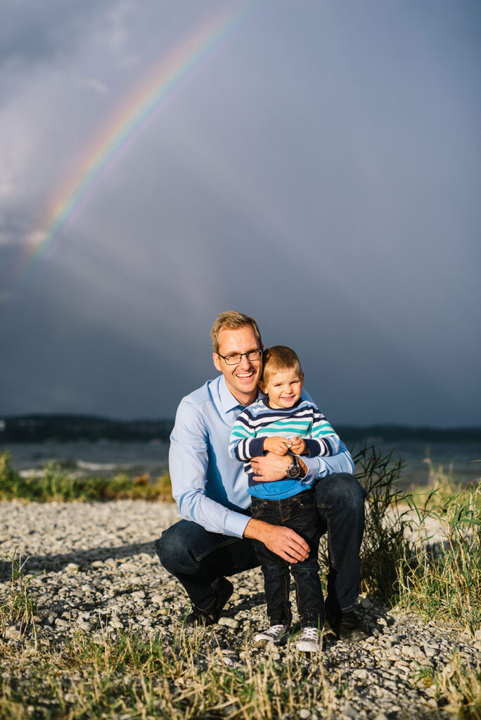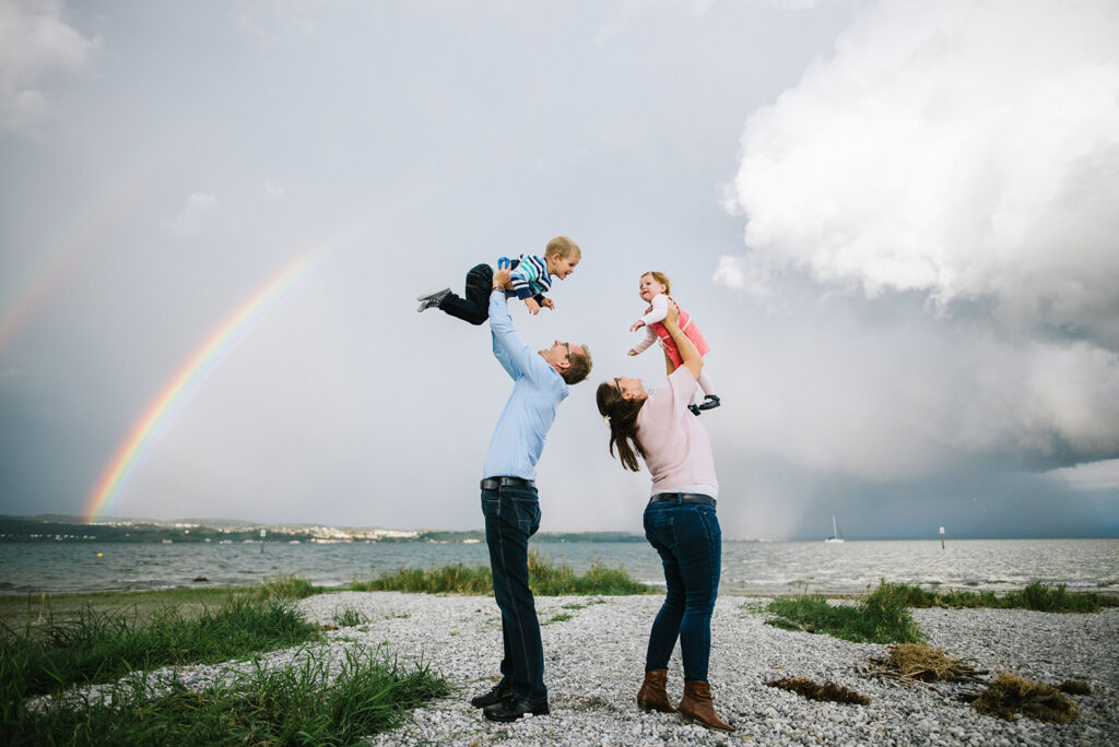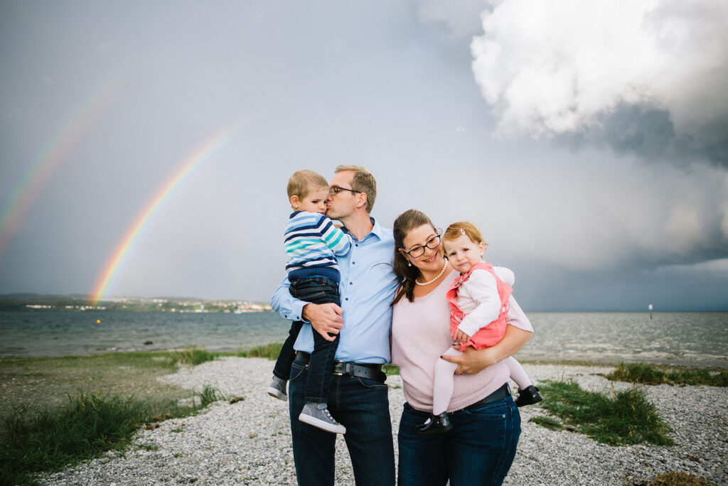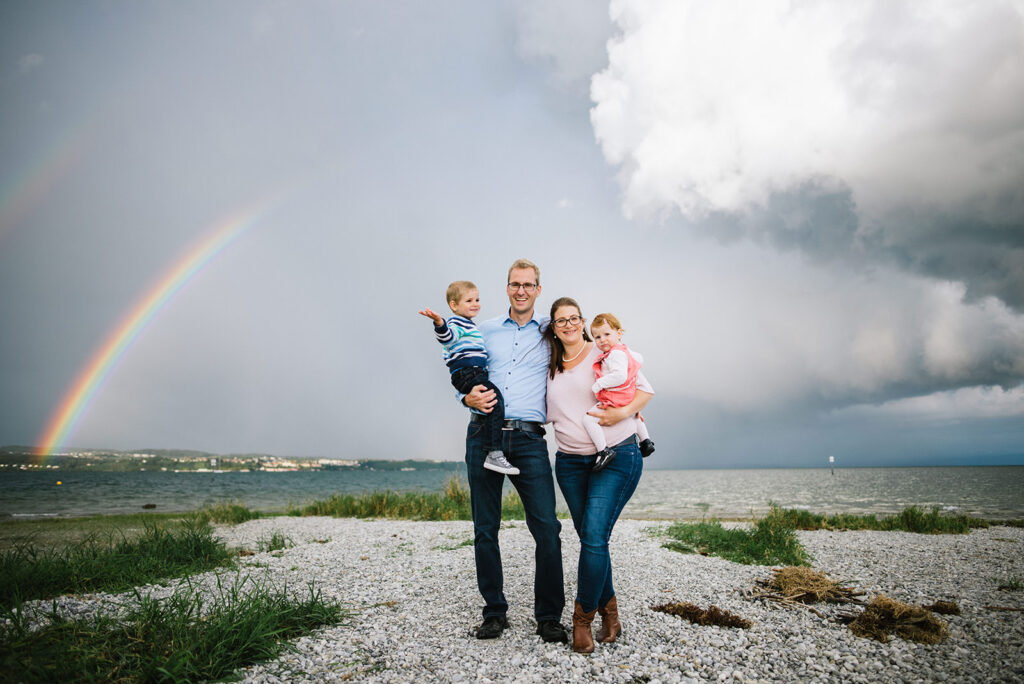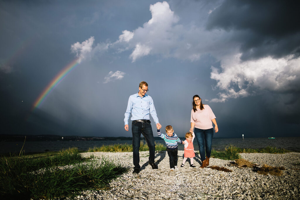 Das Licht in der Natur ist dynamisch und bedarf Flexibilität, Erfahrung und ein Quäntchen Glück – so dass wir bei einem Familienshooting, das wir aufgrund einer Unwetterwarnung fast abgesagt hätten, mit dynamischen Gewitterwolken, buntem Regenbogen und warmem Abendlicht beschenkt wurden (was das Familienleben aus meiner Sicht schön symbolisiert).
